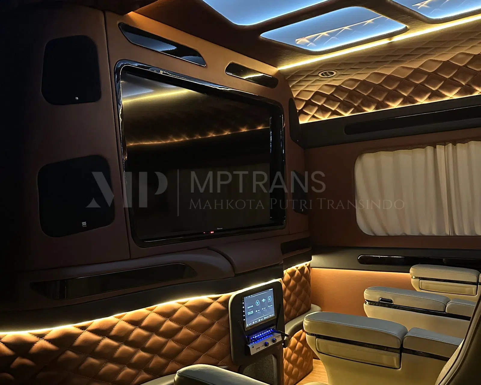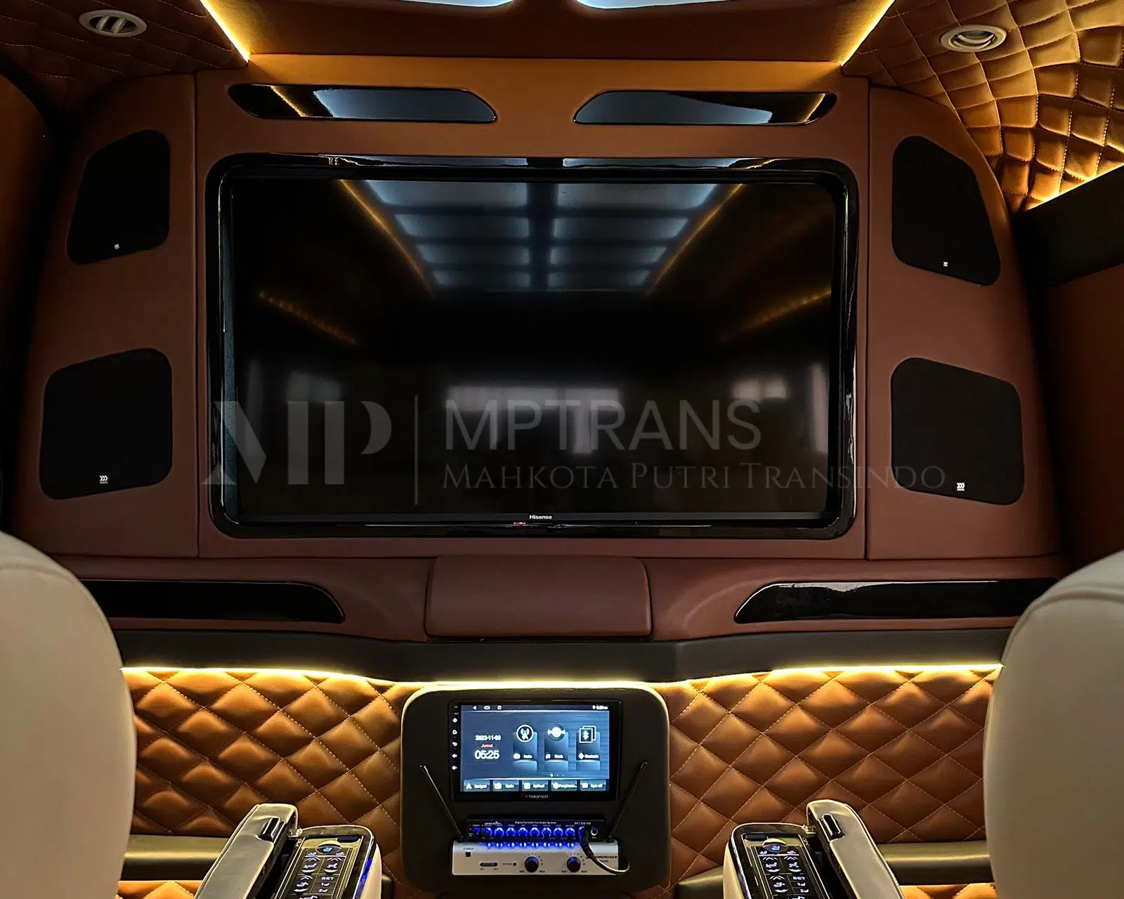 Mobil ini disematkan dengan banyak fitur canggih, seperti sistem hiburan dan sound system terbaik, sistem navigasi, koneksi Bluetooth, dan banyak lainya. Fitur-fitur ini akan meningkatkan kenyamanan Anda dan rombongan untuk perjalanan jarak jauh yang seru dan tak terlupakan. Karena MPV ini sudah dilengkapi dengan TV 43 inc, netflix, Youtube dan Wifi.